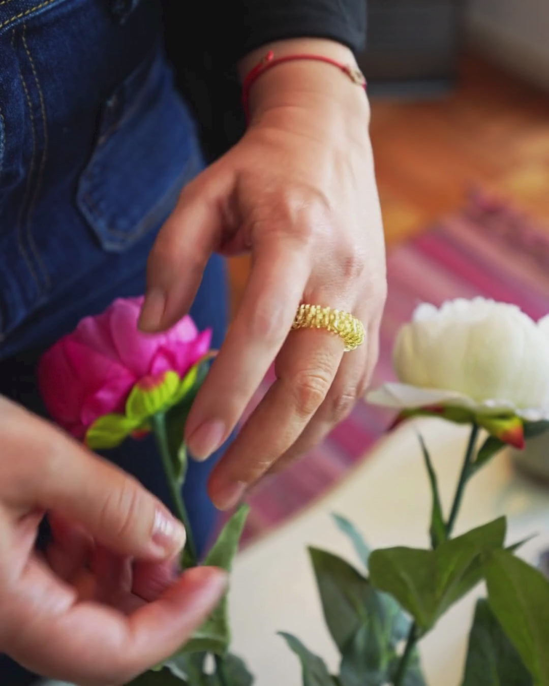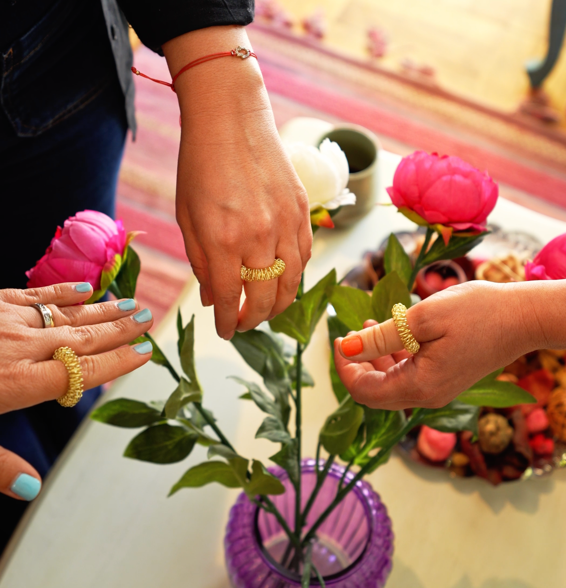 Rueda y masajea: Pasa el anillo suavemente por cada dedo, de la base a la punta, aplicando una presión leve pero constante.